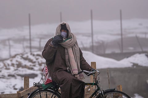 A Kashmiri cyclist with his head wrapped in a shawl looks around on a cold and foggy morning in the outskirts of Srinagar.