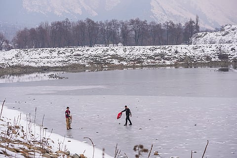 People walk on a frozen pond on the outskirts of Srinagar. Cold conditions have tightened their grip on Kashmir, with the valley bracing for fresh spells of snowfall as two back-to-back western disturbances are likely to affect the region starting Wednesday.