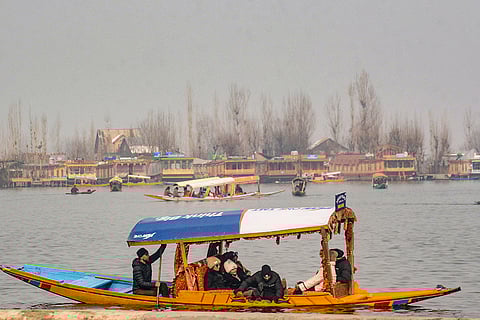Visitors ride on a 'shikara' on a winter day, at the Dal Lake in Srinagar. Several parts of Kashmir, including the plains of the valley, received fresh snowfall on Thursday, with moderate to heavy snow in the higher reaches, leading to an improvement in the minimum temperatures.