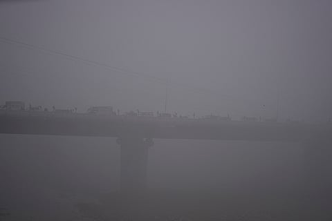 Vehicles move on a bridge amid dense fog in Jammu.