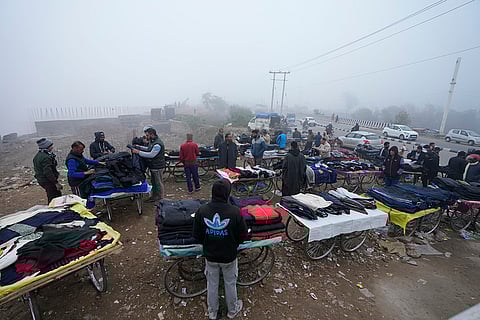People shop for warm jackets amid dense fog in Jammu.