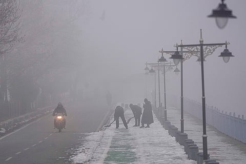 Kashmiri men employed by the government to clear snow, work on a pavement on a cold and foggy morning in the outskirts of Srinagar.