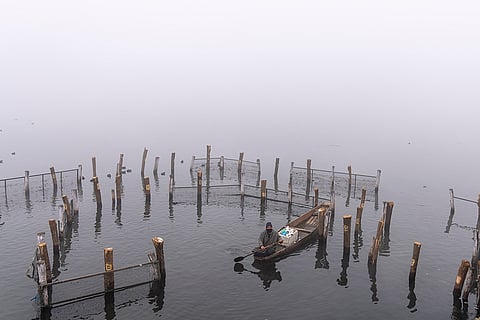 A Kashmiri rows his Shikara, or wooded boat, on a cold and foggy morning in the outskirts of Srinagar.