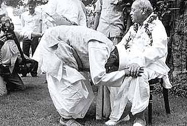 The late Congress president Sitaram Kesri, as a mark of obeisance, places his Gandhi topi at the feet of former Prime Minister Narasimha Rao.