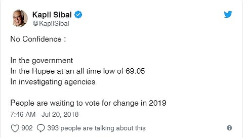 Ahead of the trust vote, Congress leader and former Union Minister Kapil Sibal tweets, "No Confidence: In the government, In the Rupee at an all time low of 69.05, In investigating agencies, People are waiting to vote for change in 2019."