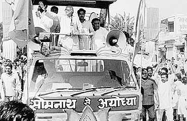 1990 September: Launches rath yatra from Somnath for temple construction.