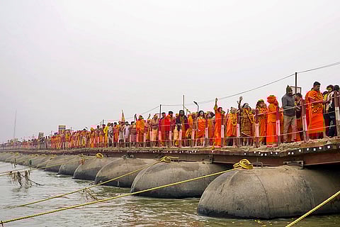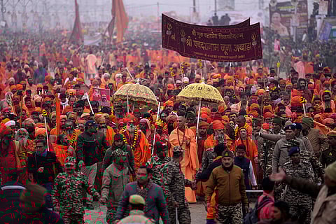 Devotees throng the banks where ascetics are bathing at the confluence of the Ganges, the Yamuna and the mythical Saraswati rivers on Makar Sankranti, an auspicious bathing day of the 45-day-long Maha Kumbh festival in Prayagraj.