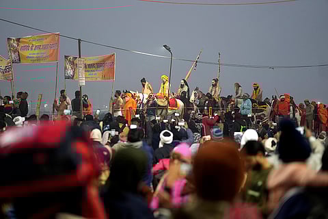 Hindu ascetics arrive for ritualistic dip at Sangam, the confluence of the Rivers Ganges, Yamuna and mythical Saraswati on one of the most auspicious day Makar Sankranti, for the Maha Kumbh festival in Prayagraj.