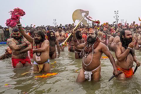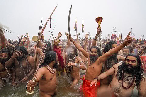 'Sadhus' take a holy dip at Sangam on the occasion of 'Makar Sankranti' during the Maha Kumbh Mela 2025, in Prayagraj, Uttar Pradesh.