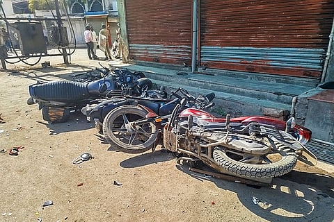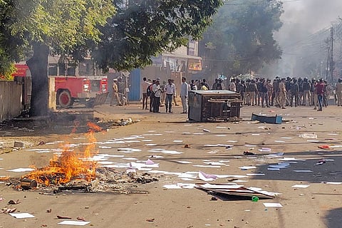 A structure set on fire during protests which continued for the second day over alleged vandalising of a replica of the Indian Constitution, in Parbhani, Maharashtra. The stone replica of the Constitution outside Parbhani railway station, set in front of a statue of Dr B R Ambedkar, was found to have been damaged on Tuesday, sparking protests.