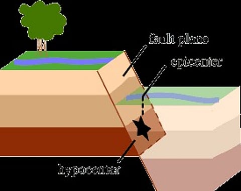 An earthquake happens when two blocks of the earth suddenly slip past one another. The surface where they slip is called the fault or fault plane. The location below the earth’s surface where the earthquake starts is called the hypocenter, and the location directly above it on the surface of the earth is called the epicenter.