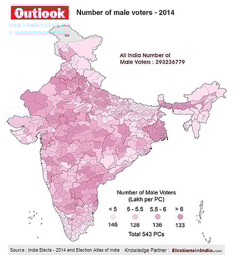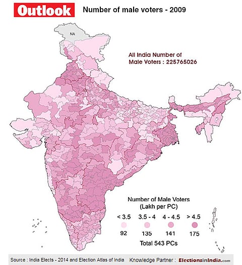 As India heads into much-awaited Lok Sabha elections to constitute the 17th Lok Sabha, Outlook brings to you some interesting facts about the demographic profile of the 543 parliamentary constituencies in the past two general elections. We focus on the concentration of male voters state-wise in the 2009 and 2014 elections .