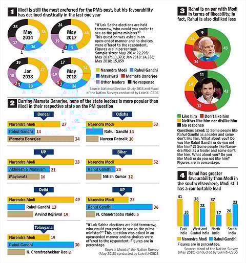 One big political question that is being asked these days is who could challenge PM Narendra Modi in 2019. All opposition parties are making desperate efforts to form an anti-Modi front at the national level to prevent a BJP victory. There are hurdles, of course, in moving forward to form this alliance, the biggest being the question of who would lead it. The political parties may be still contemplating on this issue, but the answer seems to be quite straightforward: among the leaders of the opposition parties, there is nobody who can pose a challenge to Modi in 2019 solely on the basis of his or her own popularity.