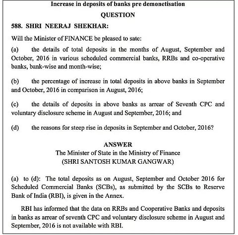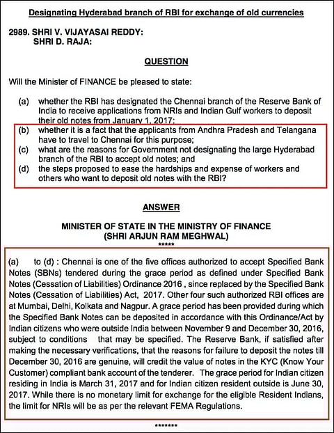 In the Rajya Sabha, YSRCP MP Vijaysai Reddy and CPI MP D Raja wanted to know why the NRIs & Indian Gulf workers from AP & Telangana have to travel to Chennai to deposit their old currency notes. They also wanted to know the reasons for not designating the Hyderabad RBI branch, one of the large RBI branches for exchange of old notes by NRIs. They also asked the steps proposed by the government to ease the hardships and expense of Indian gulf workers who wish to deposit their old notes. In response, the Minister of State for Finance, Arjun Ram Meghwal had a standard answer that mentions the names of the five RBI branches that have been designated to deposit old notes during the grace period. He did not answer the core questions raised by both the MPs about Hyderabad not being chosen and the steps being taken to ease the hardships.