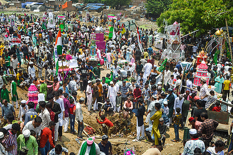 Devotees bury ‘Tazias' at a local Karbala during Muharram, the first month of the Islamic calendar, in Agra.