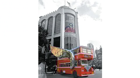 The Flying Bus is an ode to that middle-class life in Mumbai. The red double-decker bus has been operational since 1937, but the numbers have gone down since. This bus is a commemoration of the iconic double decker of Mumbai. Installed in 2012 at Maker Maxity in Bandra Kurla Complex in Mumbai, the artist forewarns us of absence by materialising it. The 9,000 kilos is not just the weight of the artwork but also the burden of nostalgia. Big dreams Public art installation by Sudarshan Shetty titled, The Flying Bus, juxtaposed against the Shiv Sena Bhavan in Dadar.