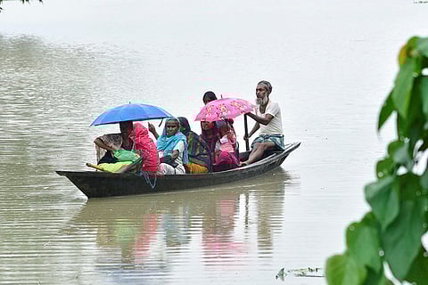 Flood affected people travel with sacks of rice in a country boat through flood waters in Mayong village in Morigaon district in the northeastern state of Assam. Floods and landslides triggered by heavy rains have killed more than a dozen people over the last two weeks in India's northeast.
