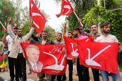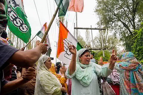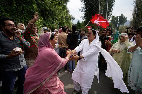 Congress party and National Conference supporters celebrate J&K Assembly poll results, in Srinagar.