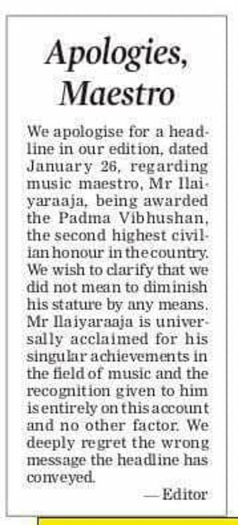 “We apologise for a headline in our edition, dated January 26, regarding music maestro, Mr Ilaiyaraaja, being awarded the Padma Vibhushan, the second highest civilian honour in the country. We wish to clarify that we did not mean to diminish his stature by any means,” it said, adding, “Mr Ilaiyaraaja is universally acclaimed for his singular achievements in the field of music and the recognition given to him is entirely on this account and no other factor. We deeply regret the wrong message the headline has conveyed.”