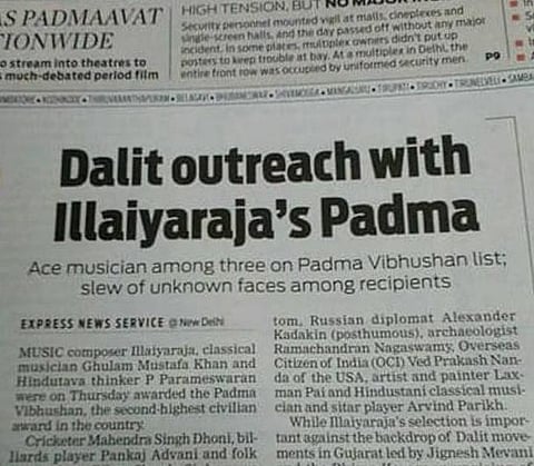 In its January 26 edition, the newspaper had run a headline on its front page stating, “Dalit outreach with Ilaiyaraja’s Padma”. Illaiyaraja's selection "is important against the backdrop of Dalit movements in Gujarat led by Jignesh Mevani and the Bhima Koregaon uprising of Maharashtra," the newspaper stated.