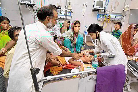There are two children and two sets of parents on every bed. Young mothers cradle limp children. Fathers fuss over immobile babies, barely visible through a maze of tubes and masks. Many more lie on the floor, with parents frantically fanning them to beat the stifling heat. Nurses and doctors run around. Machines blink and glow. High-pitched wailings hush the crowd, sometimes, as little bodies swathed in white are carried out. Or “Wapas jao (go back)” protests ring out as TV anchors or ministers float in and out. But only for a moment. There’s no time to grieve or get angry. The clock is ticking on very sick children.