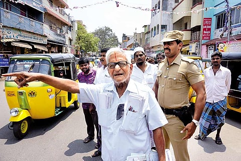 Ramaswamy earned his prefix after voluntarily helping the police regulate traffic in busy areas. After discovering the power of PILs, Ramaswamy has also taken on the powerful shop owners of T. Nagar for building violations and the granite lobby in Madurai for unlicensed quarrying, amongst others. His latest battle has been against the roadside banners erected by political parties. When the authorities did not follow the diktats of the HC, Ramaswamy and two of his associates would themselves get rid of those. “Often, people call me to inform about banners blocking pavements and jutting into roads. I take action when the authorities don’t,” he explains.