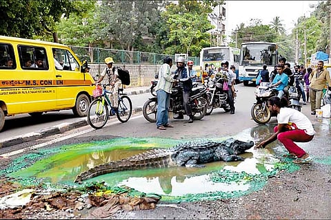 The crocodile artwork was one of his earliest. “I saw the pothole on the commute everyday. It had been there unattended for several days and affected traffic. The idea behind placing a crocodile there was to get the attention of authorities. And it worked. The pothole was repaired almost immediately,” says Nanjundaswamy.