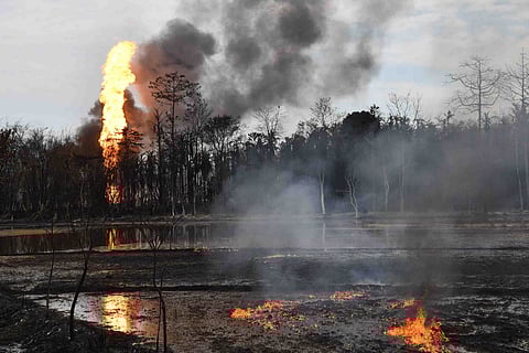 For more than two weeks Baghjan is burning, causing serious air and water pollution. Thousands of villagers have fled, their cultivations devastated; many mammals, birds, reptiles and fish have died. Two firefighters have lost their lives. persons. An immature Endangered Ganges river dolphin and a Particoloured flying squirrel have died too. The condition of the Endangered Wild water buffalo is not known but their grassland habitat already burnt.