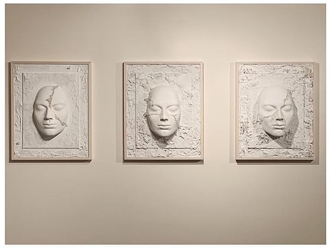 Moving to the second wall, of Acceptance, Mirpuri now gives the face a calmer expression to denote that the victim has accepted that there is violence and she needs to deal with it. To denote the transition to a desire to move on and away from the source of abuse, the artist let the plaster interact with the face. The pain is thus a stepping stone to growth.