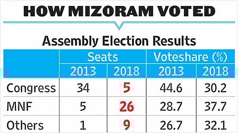 The Congress is thrown out of power after two consecutive terms (2008-2018) in Mizoram. The Mizo National Front (MNF) which has been out of power since 2008 has come back with a majority of 26 seats. This election saw the BJP make its debut in the Mizoram assembly for the first time with one seat. The Zoram People’s Movement (ZPM), which is a conglomeration of six local political groups, has won eight seats; its chief ministerial candidate Lalduhoma winning in two constituencies. Smaller parties not having enough punch such as PRISM and Zoram Thar also contested.