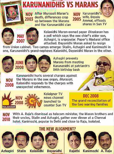 The grand family reunion came about six months later, but whether all was forgiven and forgotten is still in the realm of speculation. Many swear it was the pragmatic thing to do. Azhagiri had begun to suffer from an image deficit after Sun TV, with its huge reach, started projecting him as nothing more than a goonda. Besides, Karunanidhi and anointed successor Stalin would find it a lot tougher to win elections with Sun TV ranged against them. It was a quid pro quo, they needed the media clout of the Marans; the latter needed the might of the state for their myriad businesses to prosper.