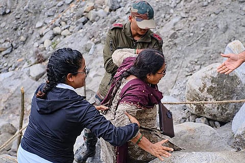 Trishakti Corps personnel during a rescue operation of locals and tourists after landslides, in North Sikkim district.