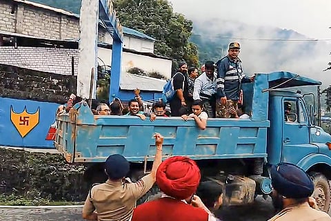 Stranded tourists being evacuated in rain-hit Sikkim's Chungthang in Mangan district.