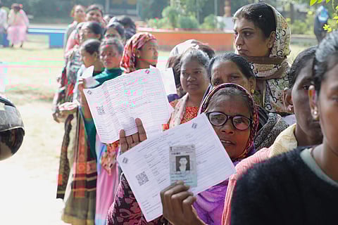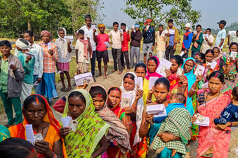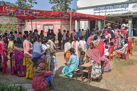Voters wait in queues to cast votes at a polling station during the second and final phase of Jharkhand Assembly elections, at Naxal-affected Tundi constituency in Dhanbad district of Jharkhand.