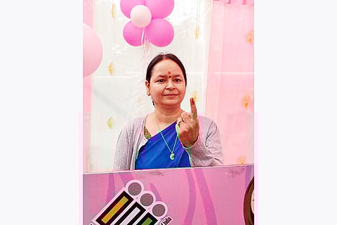 A voter shows her finger marked with indelible ink after casting her vote at a polling booth during the final phase of Jharkhand Assembly elections, in Ranchi.