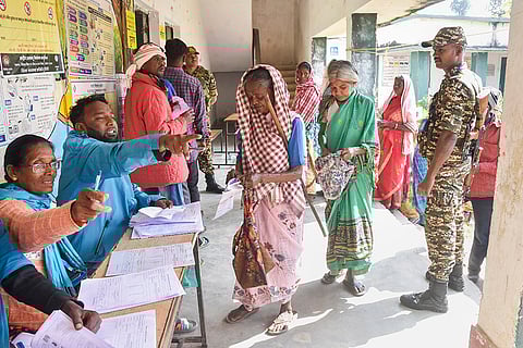 People wait in a queue to cast votes at a polling station at Khijri, during the final phase of Jharkhand Assembly elections, in Ranchi.