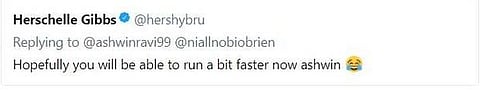 Replying to Ashwin, who is not among the fastest on the field in the current Indian set up, Gibbs jokingly tweeted: "Hopefully you will be able to run a bit faster now Ashwin."