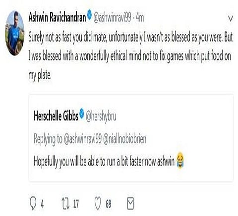 Ravichandran Ashwin and Herschelle Gibbs were on Monday involved in a twitter spat, in which the India off-spinner could not stop himself from taking a match-fixing jibe at the former South African batsman.