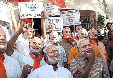 The question being asked is, who makes up Team Modi? There is a core group of bureaucrats. But Modi is his own brand ambassador, who may weigh inputs from various sources but takes all the decisions himself. And he has developed a very clear-cut style. For instance, as he tries to rise above the dark stain of the post-Godhra violence in Gujarat, he has positioned himself very carefully. He talks tough on terror, but does not mention Muslims or the minority community. He has chosen to say nothing about the Bajrang Dal that has been in the thick of national controversy after the assaults on Christians. But it is known that within Gujarat, Modi has clobbered the Bajrang Dal and has no time for the VHP. It is whispered in Sangh parivar circles that Modi will not attend a meeting if VHP leader Praveen Togadia is in the room. A parivar insider reveals: "This attitude of Modi has made it hard for Praveenbhai to operate within his home state, Gujarat. That is why he travels out more and more."