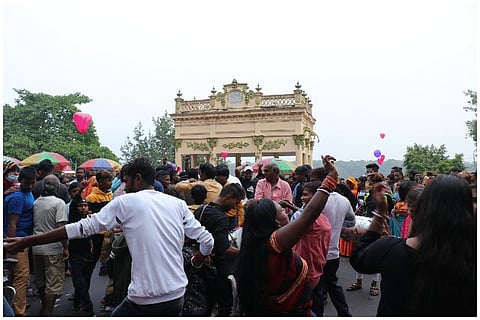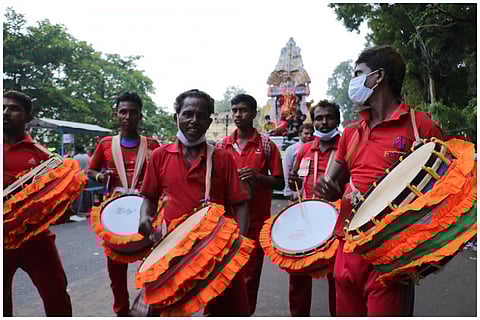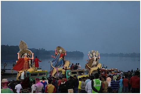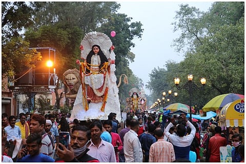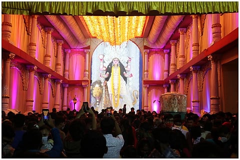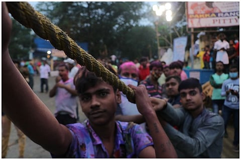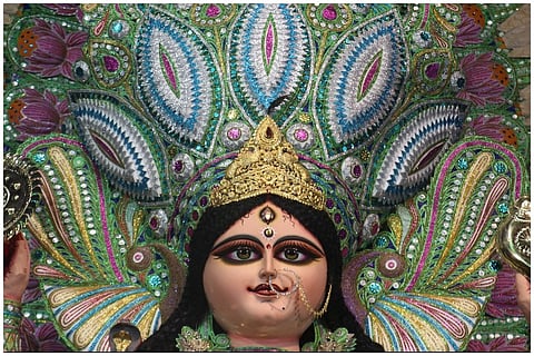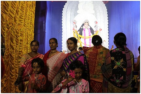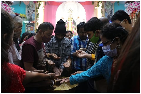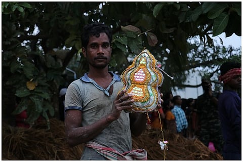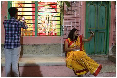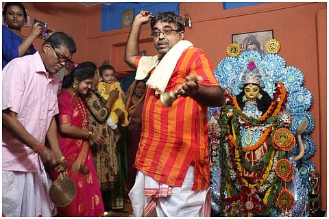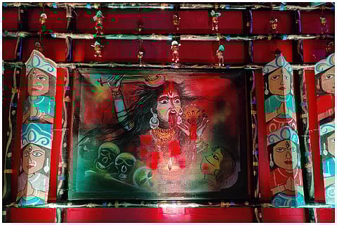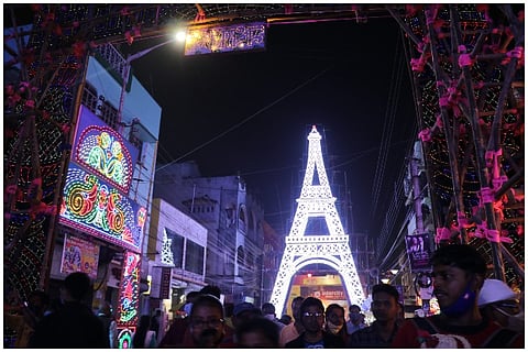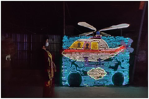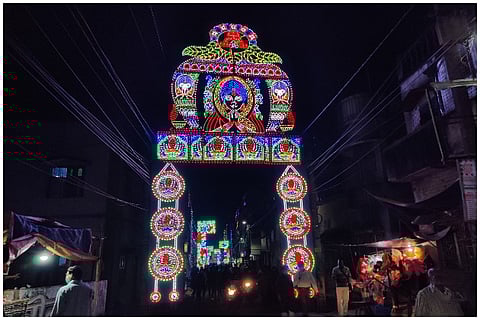 The Das family home with its little blue door mounted on a threshold is one of the many inconspicuous houses that line the main road of Lalbagan Padripara in Chandannagar. Its residents, three generations of a former joint family that now meet only on birthdays and funerals (as is the norm with former joint families), are seldom seen together. But on the second Saturday of November, when I happened to pass it by, the otherwise staid house had shed its quiet demeanour and dressed up in a cloak of decadent ‘tuni’ lights.