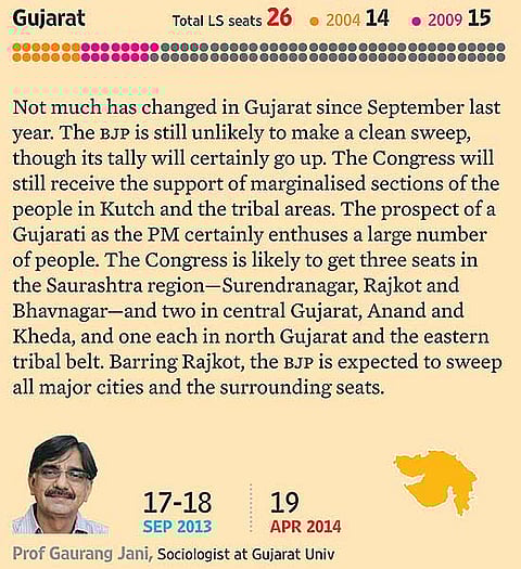 At the end of April, we went back to the same 29 experts, and their ‘Gumshoe Guesstimate’—the old-school way of measuring elections before psephologists became part of our lexicon—now give us a consolidated figure of 229, up 42 from six months ago, but a number which contests most opinion polls which unanimously speak of a so-called “Modi wave”.