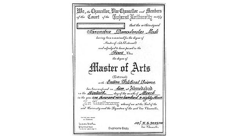 For an ‘external’ or private student in 1983, Narendra Kumar Damodardas Modi had done quite well in his MA (Political Science) with 62.3 per cent. When Gujarat University VC M.N. Patel opened up the records, the suspense caused by the earlier refusal to reveal the details and the CIC order to do so was finally over. Or was it? Nitpickers soon pointed out that the date of birth in the college register (29/8/49) did not tally with the date on his electoral affidavits (17/9/50). And why had the pages with handwritten entries not yellowed even after 33 years, some asked. The plot thickened after a duplicate certificate surfaced of the MA degree in “Entire Political Science”.