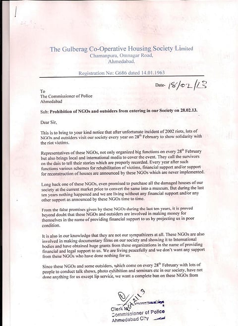 In a signed letter dated February 18 addressed to the Ahmedabad police commissioner , the residents have stated that the unfortunate incident of the 2002 riots, are being used by a variety of NGOs and outsiders who visit the society every year on February 28 to show solidarity with the riot victims and use it for their narrow ends.