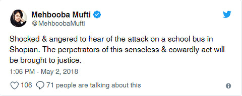 "Shocked and angered to hear of the attack on a school bus in Shopian. The perpetrators of this senseless and cowardly act will be brought to justice," she tweeted.