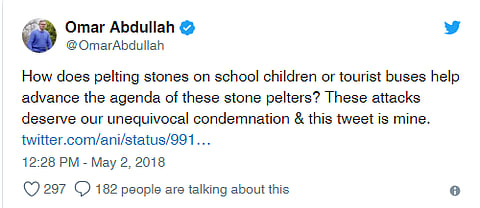 "How does pelting stones on school children or tourist buses help advance the agenda of these stone pelters? These attacks deserve our unequivocal condemnation & this tweet is mine," Omar wrote on his Twitter handle.