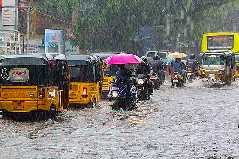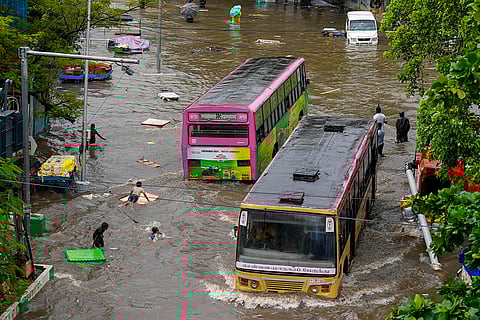 Vehicles ply on waterlogged roads amid rains, in Chennai.