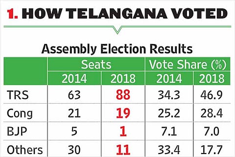 The 2018 Telangana legislative assembly election saw the incumbent Telangana Rashtra Samiti (TRS) win with a 47 per cent vote share and 88 seats (see Table 1), riding on the platforms of pride in the newly formed state and a slew of welfare measures—both of which earned it support from a broad spectrum of social sections. The outcome has produced yet another state-level party that aims to play an important role in national politics.