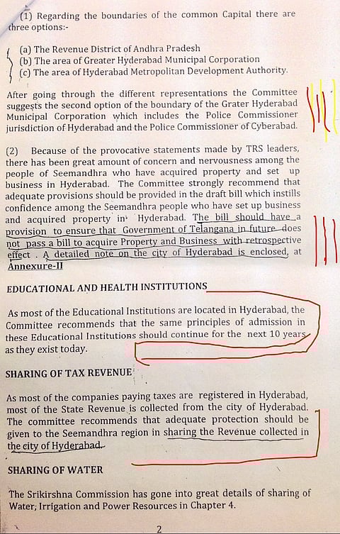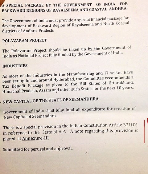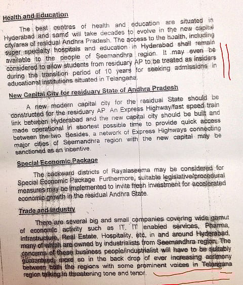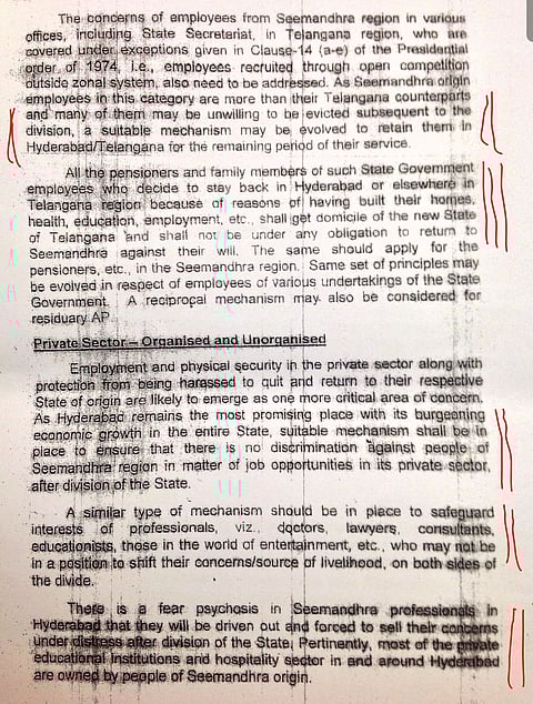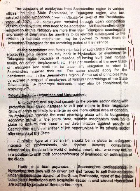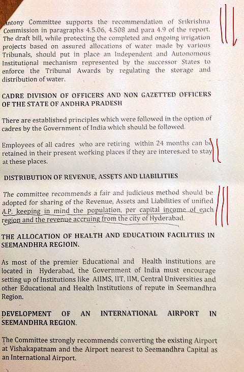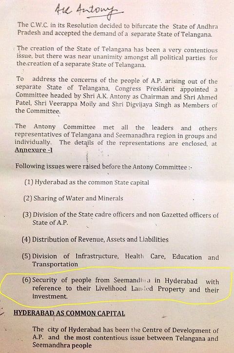 Even as the Group of Ministers continues to discuss and debate the draft Bill on Telangana, a report issued by the A K Antony Committee on Oct 4, 2013 has come to light. Among the many points that the committee makes on revenue, water, education and Hyderabad's status as common capital for 10 years, the panel consistently voices its concern for Seemandhra people settled in Hyderabad and elsewhere in Telangana. It cites special provisions to be made to protect their interests.