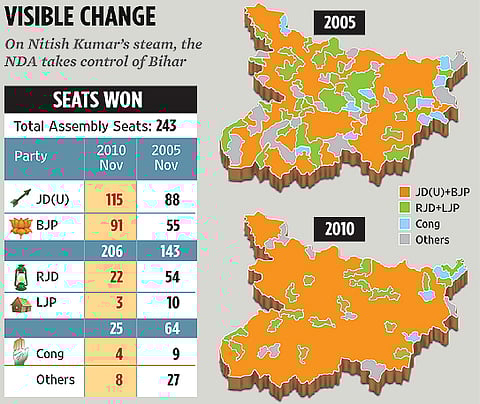 N.K. Singh, a former bureaucrat and a JD(U) nominee to the Rajya Sabha, speaks of the shift in Bihar politics. “The results show there’s a paradigm shift in the very psyche of Bihar,” he says. “Nitish went to the people with his work and that of his government. His three yatras took the government to the people, and they voted for a performance- and development-centric government.” Nitish had been banking on this. Rally after rally, he told voters to compare his five-year term to the 15 years of the Laloo-Rabri regime. He addressed over 300 rallies in the last one month. He spoke of his work—new roads, better education, particularly for the girl child, jobs for the poor, empowerment of women through 50 per cent reservation in panchayats and the decriminalisation of the state with some 50,000 convictions. He promised people a “fear-free Bihar” and a developed state that would evoke “Bihari pride”. Also working to his advantage was his new constituency of women voters. His confidence in them was reflected in what he said even before polling began: “You’ll see 25-30 per cent more voting in Bihar. Women will come out and vote, and, regardless of what the menfolk in their families decide, they’ll vote for me.”