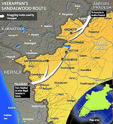 The fact that the loot went to Kerala has been confirmed by forest officials. Says Tamil Nadu forest ranger Bhadraswamy who headed the first commando squad formed to nab Veerappan, "Most of Veerappan's sandalwood was going to factories in Kerala, particularly Palakkad district." K. Chella Durai, another range officer feted for a huge seizure of sandalwood a few years ago, confirms the route of the illicit sandalwood. Both officers wanted to search some of these factories, but the inter-state legal boundaries kept them away. It is also an open secret that the sandal oil factories enjoyed the patronage of successive state governments in Kerala.